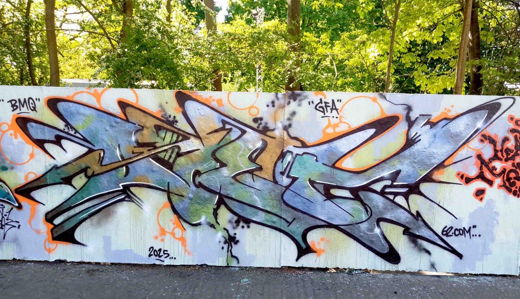„Heavy metal“ wall, Potsdam 2025. Only metallic spraypaint for a Toomvision produktion with Dipl & Toom. „Buntes Crome“ Graffiti Vlog 113 via Youtube Videolink.